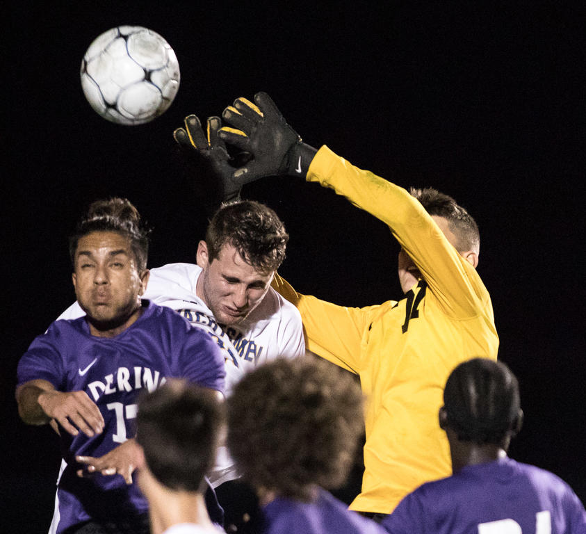 Falmouth senior Brendan Hickey manages to head the ball past Deering sophomore goalkeeper Max Morrione for the game’s first goal.