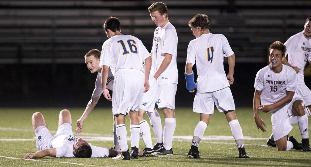 Falmouth senior Brendan Hickey lies prone on the turf after scoring the first goal of Tuesday’s home showdown against Deering. The Yachtsmen would pull it out, 2-1, on senior Nate Arrants’ late penalty kick.