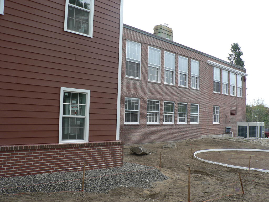 Old and new meet in the Plummer School redevelopment project. This area to the side of the building will include a community patio.