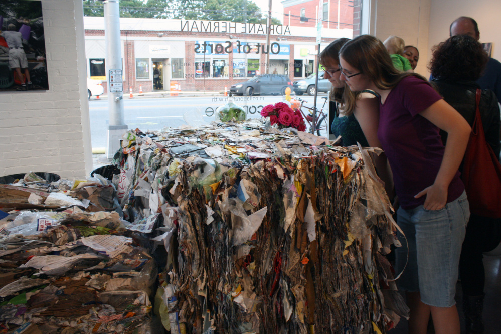 Adriane Herman’s “Out of Sorts” at Speedwell Projects features five large rectangular bales of recycled materials gathered and compressed by Ecomaine, as well as photographs, printed fabrics and benches created from repurposed materials.