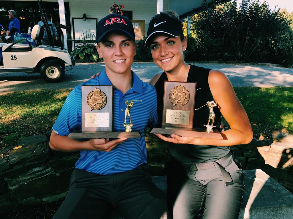 Scarborough’s Anthony Burnham, left, and Elizabeth Lacognata show off their championship trophies after Saturday’s individual golf championships at Natanis Golf Course in Vassalboro.