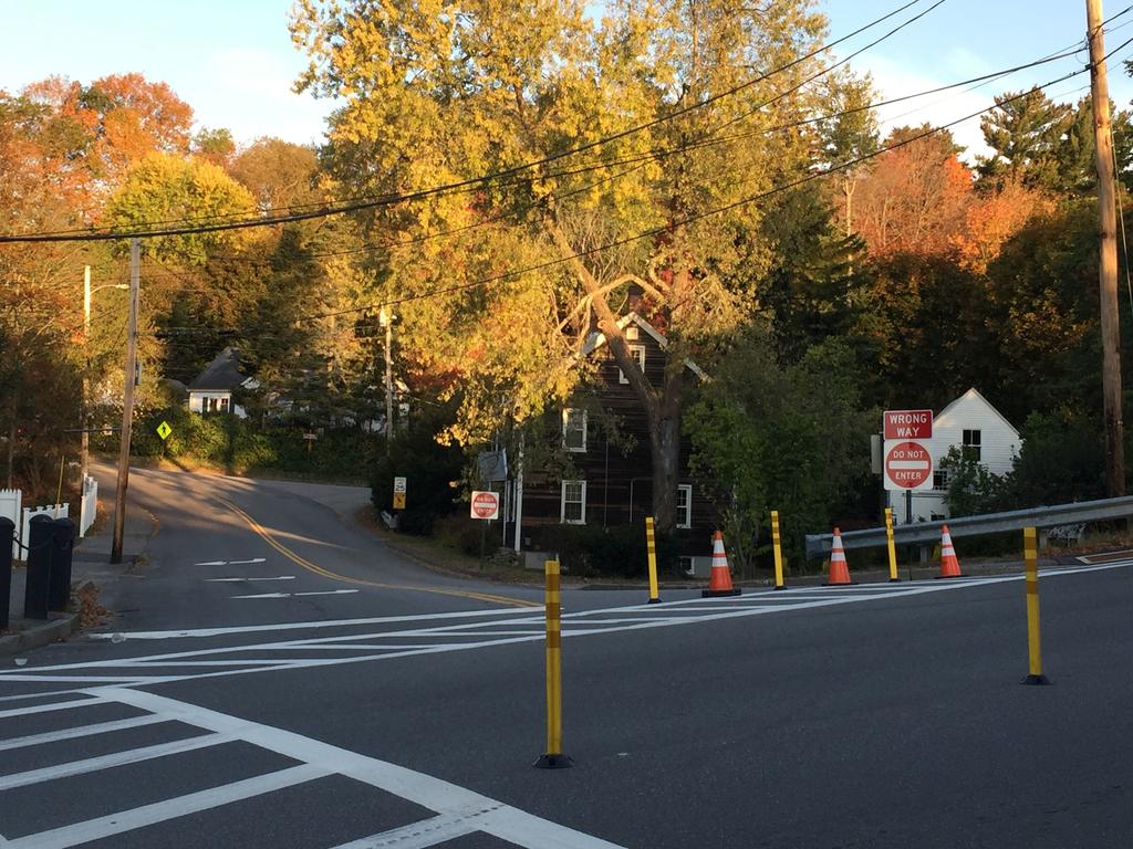 During the trial, the last block of Winter Street where it intersects with Main Street has been changed to one-way traffic. Left-hand turns from Main Street onto Winter Street are prohibited; motorists instead turn left about 250 feet north onto Elm Street Extension, which connects to Winter Street.