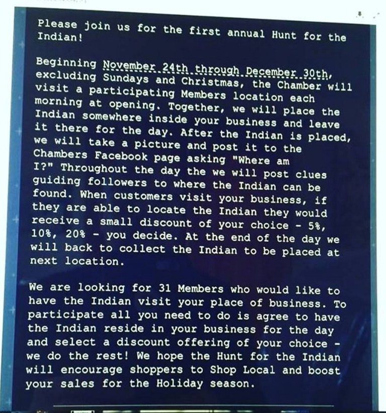 The promotion, announced in emails sent Saturday morning and slated to run Nov. 24-Dec. 30, asked chamber members to join them in placing a small “Indian” figurine inside one of their businesses each day. A photo of the figurine in the store for that day was to be posted on the chamber’s Facebook page along with clues about where it could be found by shoppers, who would receive discounts on merchandise if they found it. The figurine would be removed at the end of the day and placed in another business the next morning.
