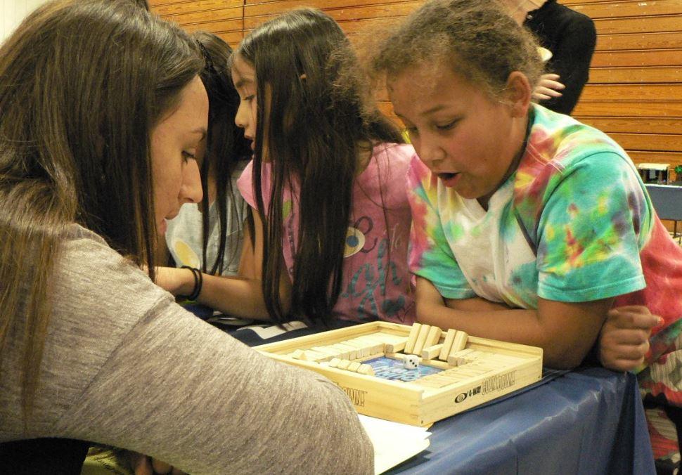 Crystal West, a student at USM, plays 4-Way Countdown with Kieara Venerable, a fifth-grader at Lyseth Elementary.