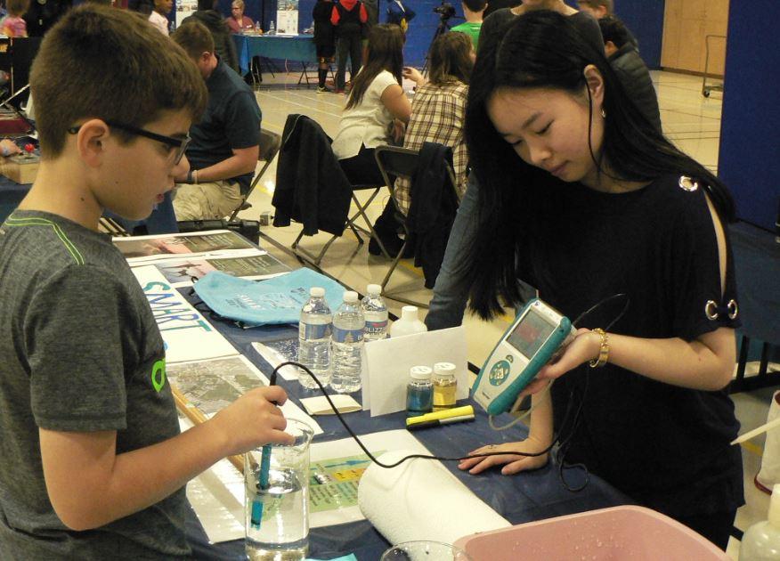 Linda Trinh, right, from Deering High School, shows Theo Gordon, from Longfellow Elementary, how to test acidity in water.