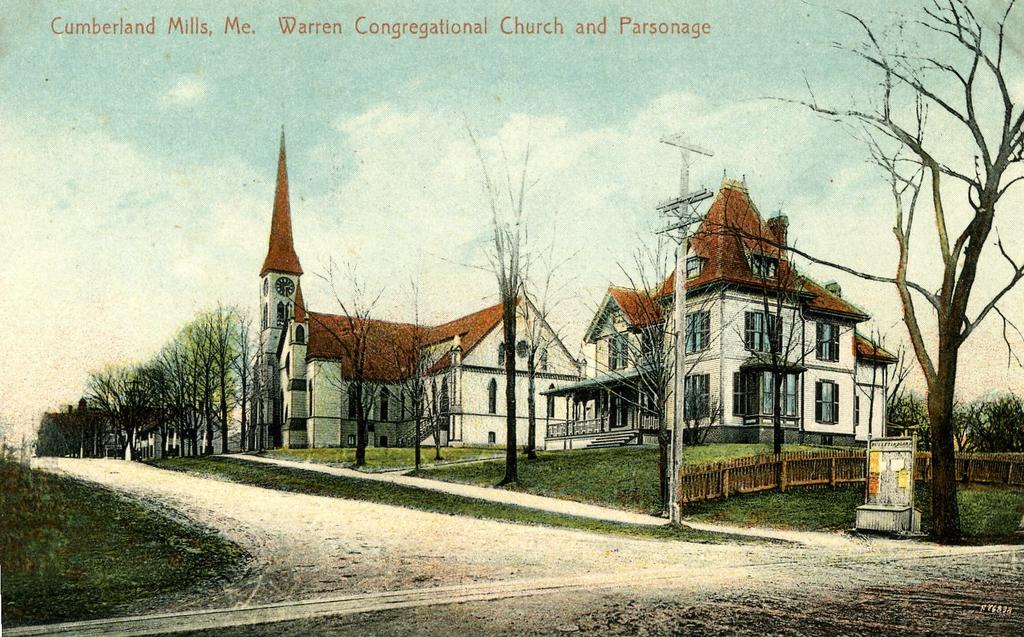 The Warren Parish formed in Cumberland Mills in 1868 when some Westbrook Congregational Church members were given permission to separate. The Warren Congregational Church was built at Cumberland Street and Warren Avenue on land donated by Samuel D. Warren, owner of the S.D. Warren paper mill. Dedicated on July 8, 1869, the building served the congregation for over 100 years. In 1880 a wooden parish house was built next to the church on the Cumberland Street side. A brick Parish Hall was built behind the church facing Warren Avenue in 1957. Warren Congregational merged with Westbrook Congregational after Urban Renewal took the old Westbrook