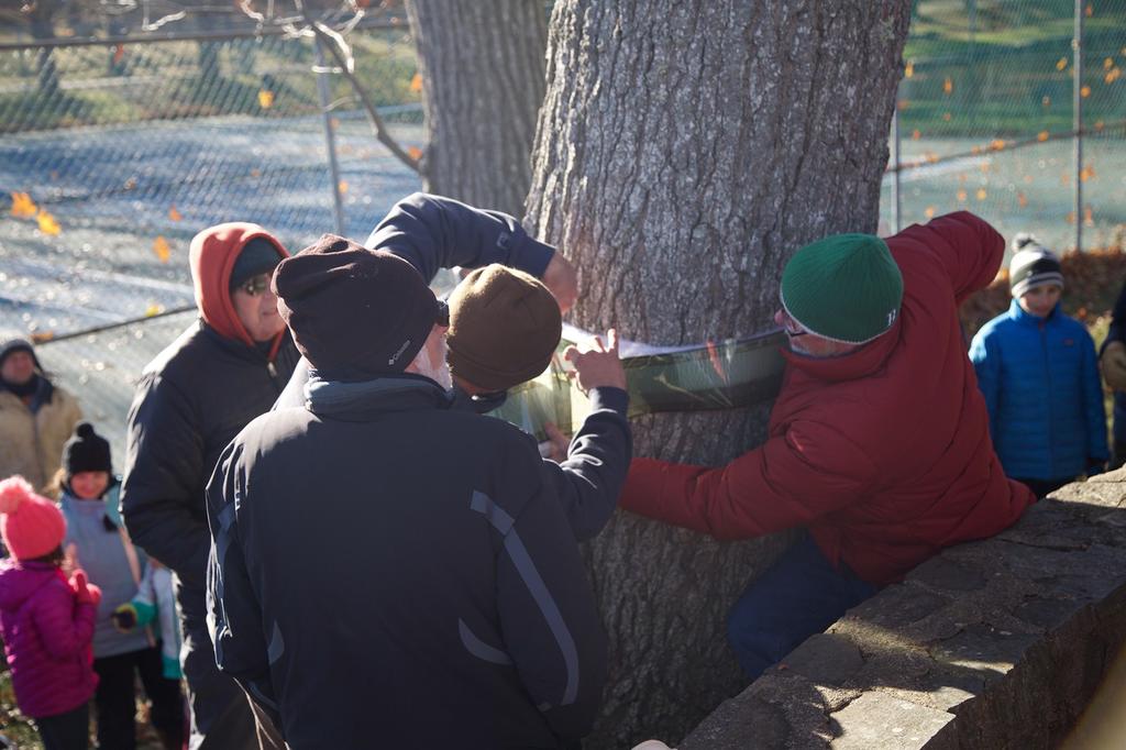 Cape Elizabeth tree warden Todd Robbins, left, and Tom Atwell, a member of the Fort Williams Park Foundation board of directors, demonstrate application of a BugBarrier Tree Band Nov. 11, when foundation members were joined in the park by more than 50 volunteers to band approximately 100 trees to help combat infestation by the winter moth, an invasive species that has destroyed thousands of trees in Cape Elizabeth. Adhesive on the bands trap female moths before they can climb the trees to lay their eggs. The banding stays in place for two to three weeks – long enough for the moths to end their egg-laying cycle. Tree-trunk banding is considered the most effective way to treat winter moth infestations.
