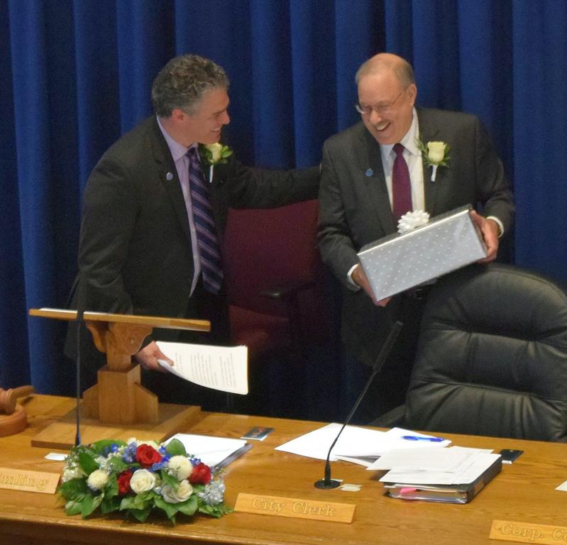 Portland Mayor Ethan Strimling and former Councilor David Brenerman share a laugh after Brenerman received a parting gift Dec. 4 at City Hall.