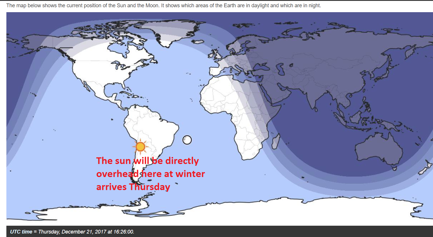 You may wonder why winter begins on Dec. 21 in the first place. Meteorologists actually started winter three weeks ago and will end it on March 1. But for astronomers winter begins on the Dec. 21. This is because every day somewhere on the planet the sun is exactly overhead in one spot at noon. That position changes each day and on the first day of winter that spot is as far south as it will ever go for the year. On June 21 – the first day of summer – that overhead position of the sun will be as far north as it goes all year.
