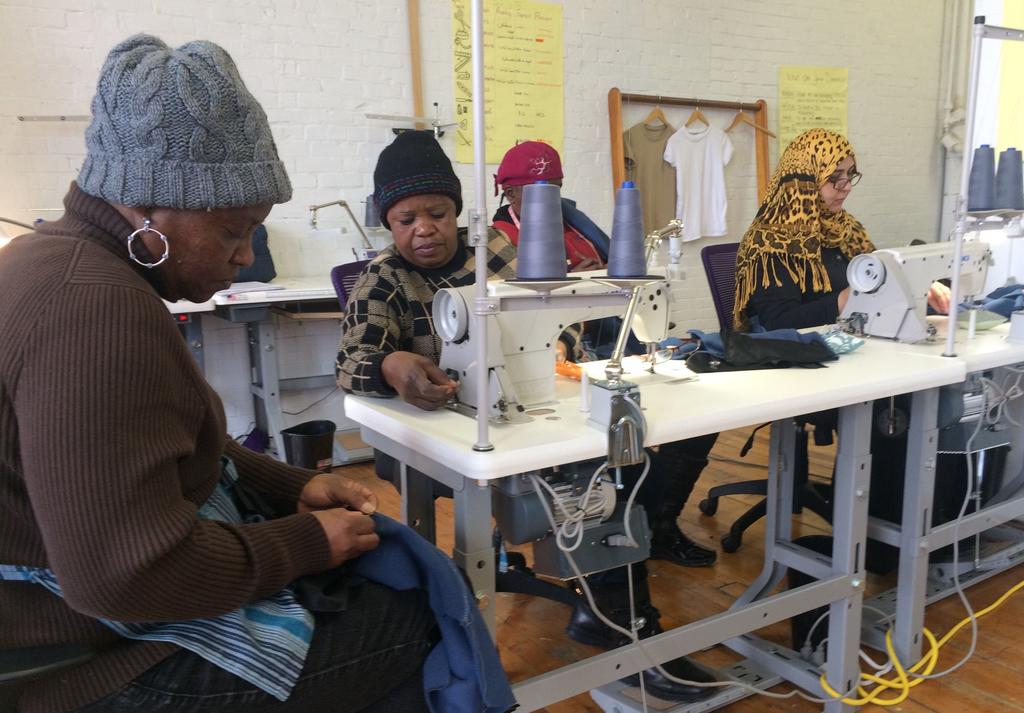 In a program facilitated by Old Port Wool & Textile Co., SMCC adjunct professor Giselle Larios, left, taught a stitching course to train new Mainers, including Debora Calum, second from left, and Zita Madzou, middle, how to work in the textile industry.