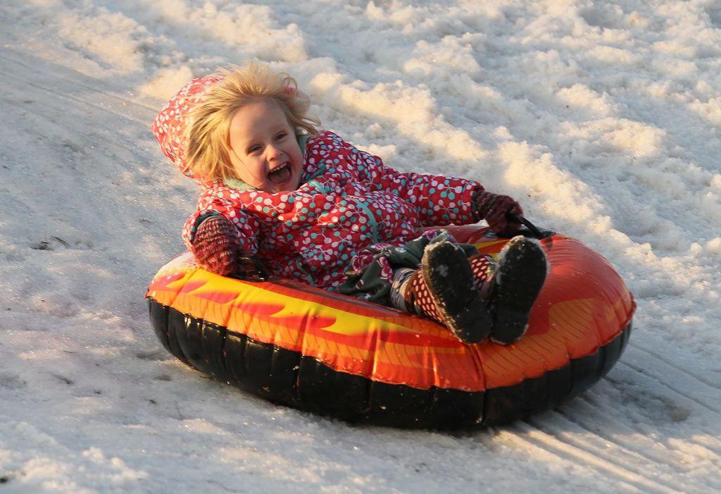 Fiona Welch, 3, of Cape Elizabeth, slides down a man-made hill at Wainwright Recreation Complex during WinterFest in South Portland in 2016.