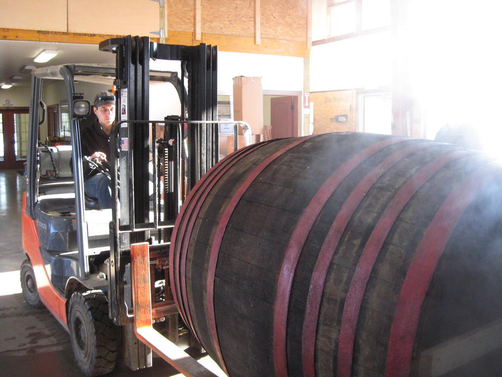 Moving a 1,000-liter beer barrel to be shipped to Michigan.