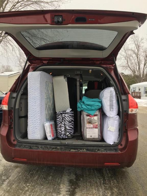 A car with donated bedding sourced by Brunswick’s Emergency Action Network.