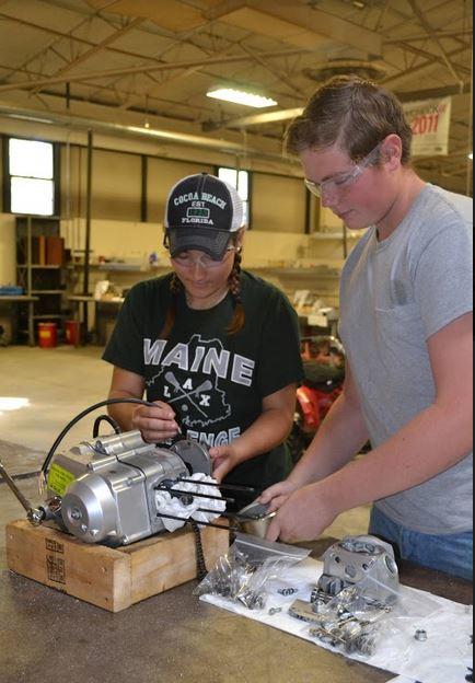 Casi Perow,left, and Richard Crossman work on an engine recently at Region 10 Technical High School in Brunswick.