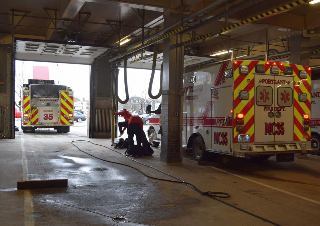 Portland firefighters preapre to answer a call Feb. 12 at the Central Station, 380 Congress St. A report recommends replacing the 93-year-old station with a building better suited to modern firefighting.