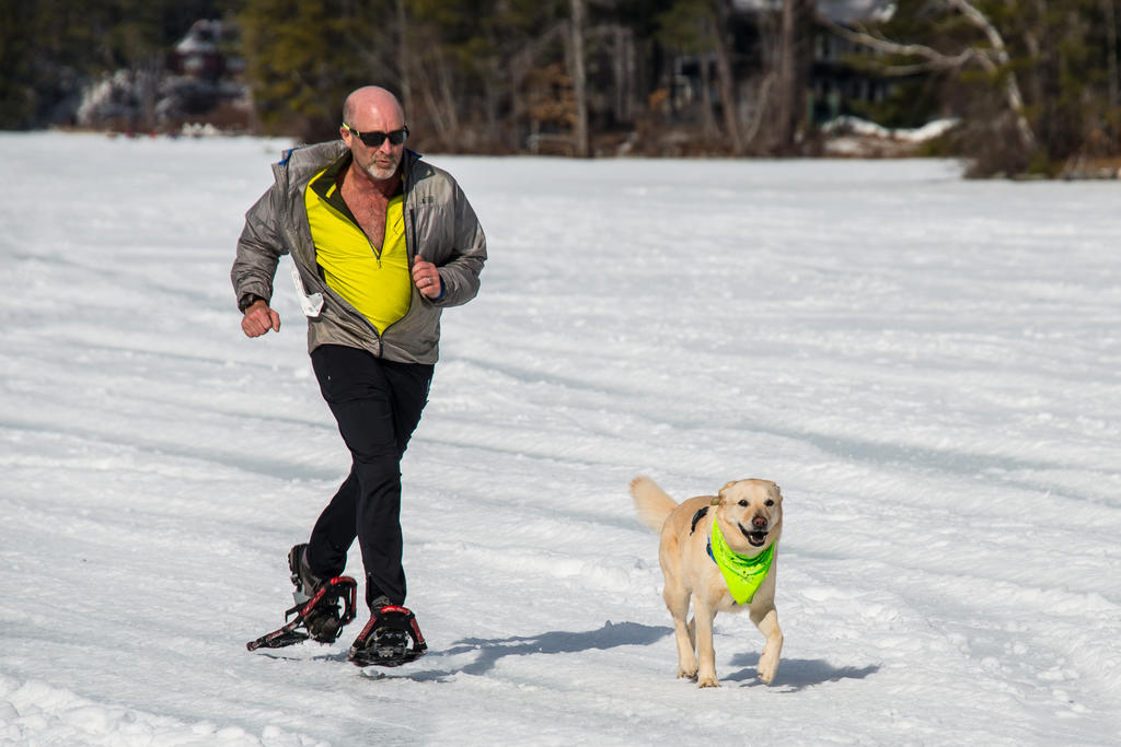 Al Sochard of Harrison and his faithful friend take first place in the snowshoe 5K at the Bridgton Winter Carnival Saturday, Feb. 17, 2018.