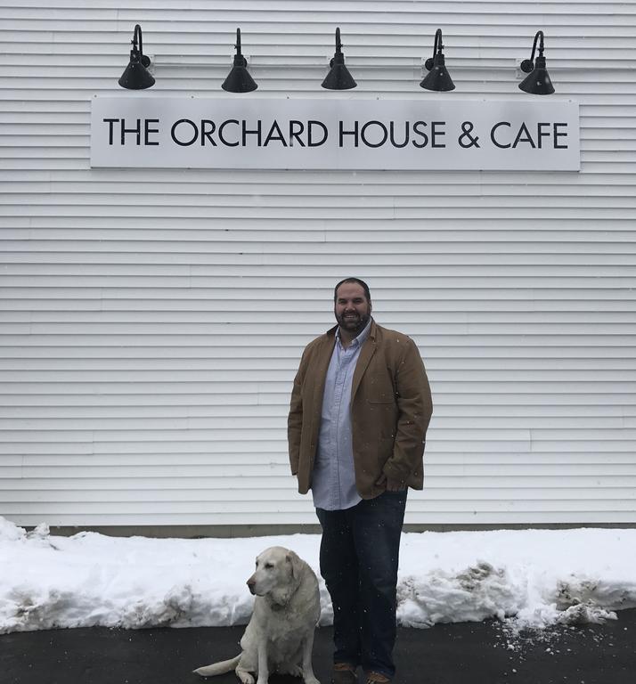 Bill Hamlen with his dog, Belle, outside The Orchard House and Cafe on Route 1 in Freeport. He purchased the property, previously owned by painter Tom Crotty, in 2016 and opened for business last October.