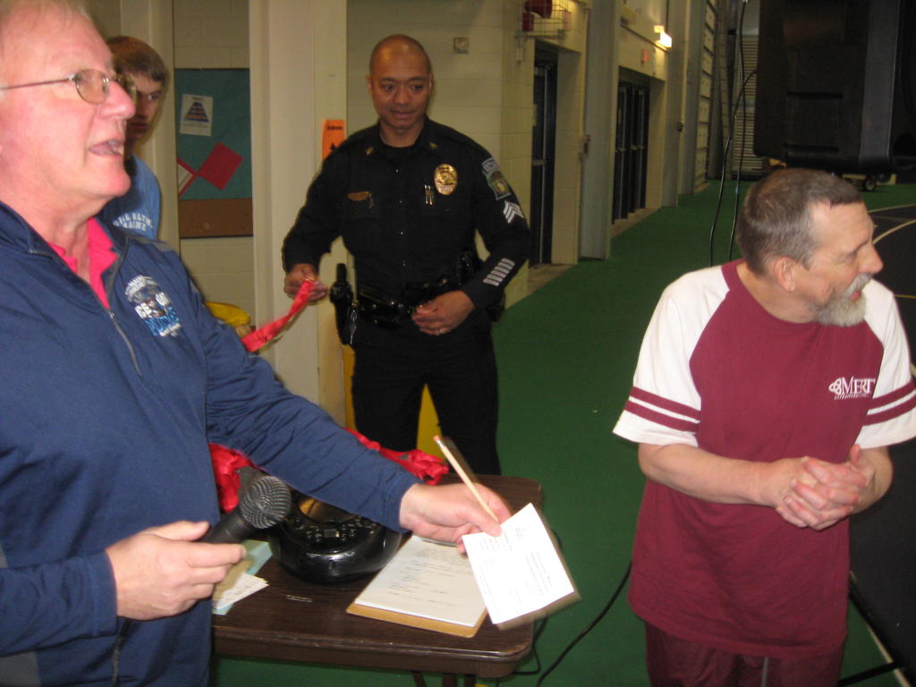 Mark Capano, event coordinator for Special Olympics’ Southern Maine Basketball Tournament, left, Saturday at USM in Gorham announces Alan Rawley of Bangor, right, as winner of an individual skills award. Sgt. Sears Edwards of Gorham Police Department assisted with the presentation to Rawley.