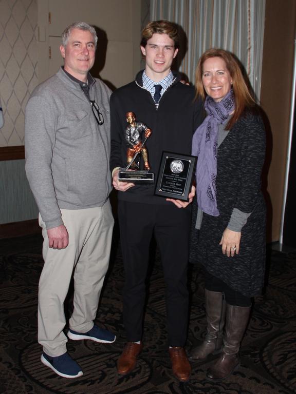 Yarmouth senior Cooper May, joined by his parents, receives the Evans Spear Award as the outstanding senior player in Class B South at last weekend’s awards banquet. The award memorializes the former Clipper, who passed away in 2004 with Hodgkins Lymphoma. May joins Walter Conrad (2015) and Alex Kurtz (2012) as Yarmouth players to win the award, which began in 2005.