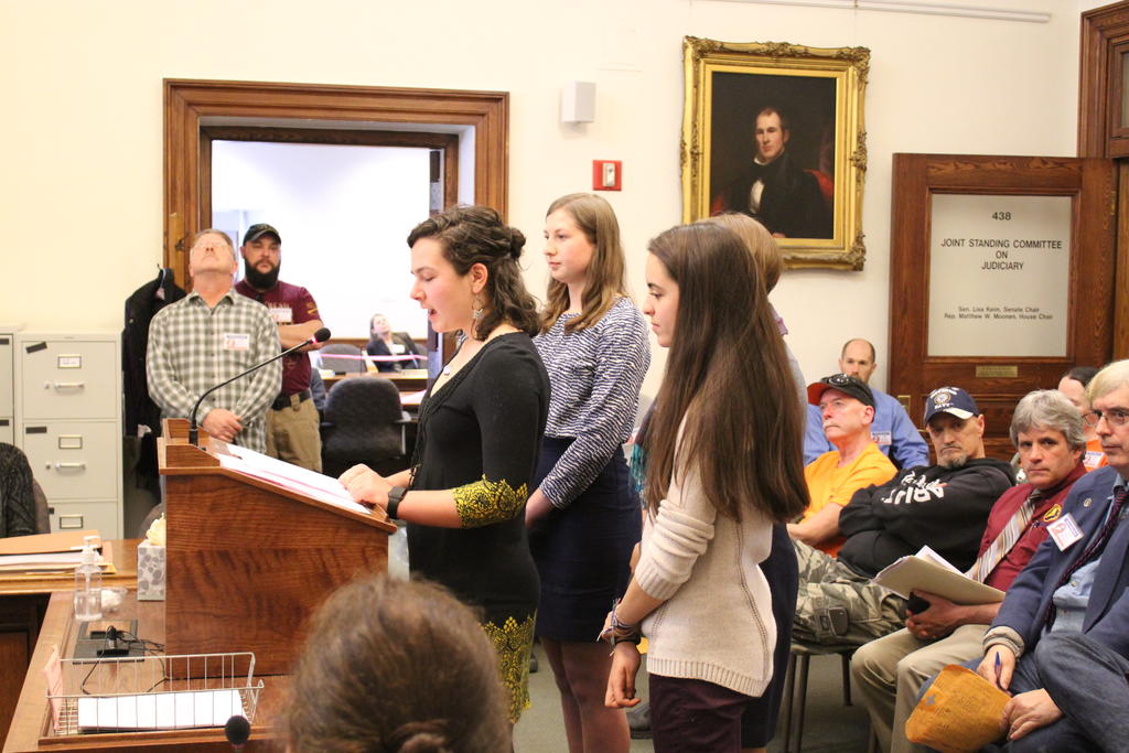 Freeport High School senior Maya Egan, flanked by students Lucy Wing, left, Rhea Fitzpatrick and Sadie Southall, testifies April 3 in Augusta during a legislative hearing on a bill that would allow courts to prevent high-risk individuals from possessing firearms.