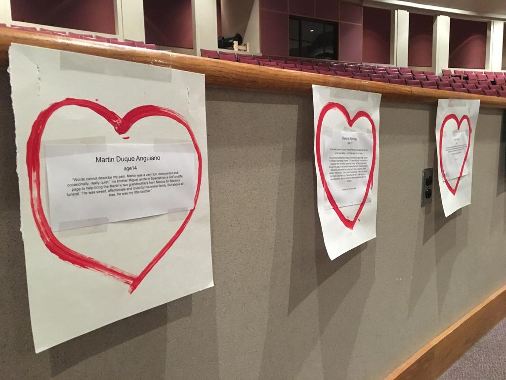 Signs bearing the name and biographies of those who died during, or as a result of, the shooting at Majory Stoneman Douglas High School Feb. 14 were hung around Brunswick High’s Crooker Theater on April 7.
