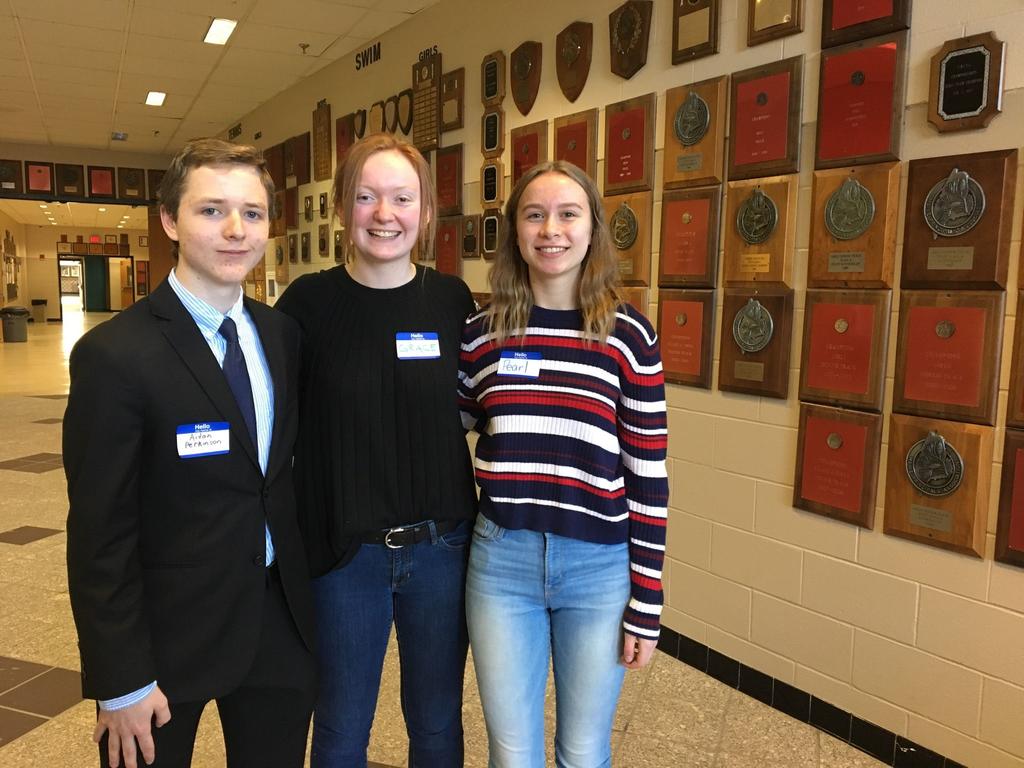 Brunswick High School students Aidan Perkinson, left, Grace Clendening and Pearl Stuart organized a “Town Hall” on gun violence April 7, following a call last month from survivors of the February school shooting in Parkland, Florida.