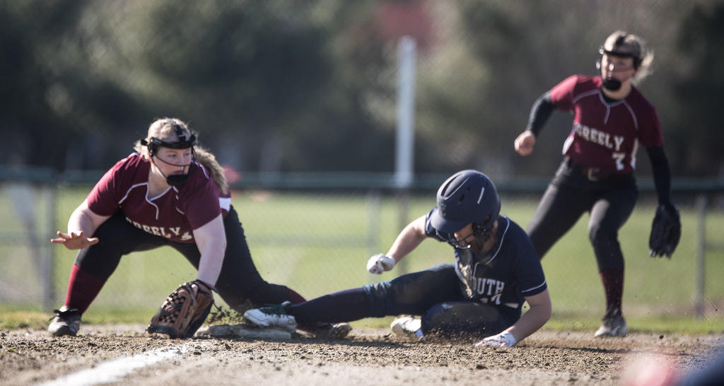 Yarmouth junior Lydia Guay steals third base as Greely junior third baseman Janelle Taylor takes the throw.