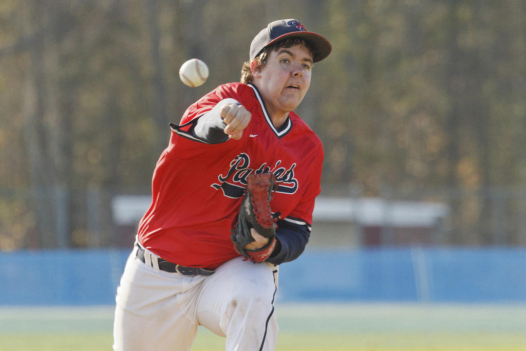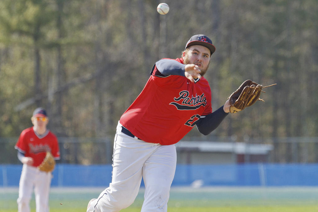 Cam Andrews unwinds into a pitch during his stint on the mound for the Patriots.
