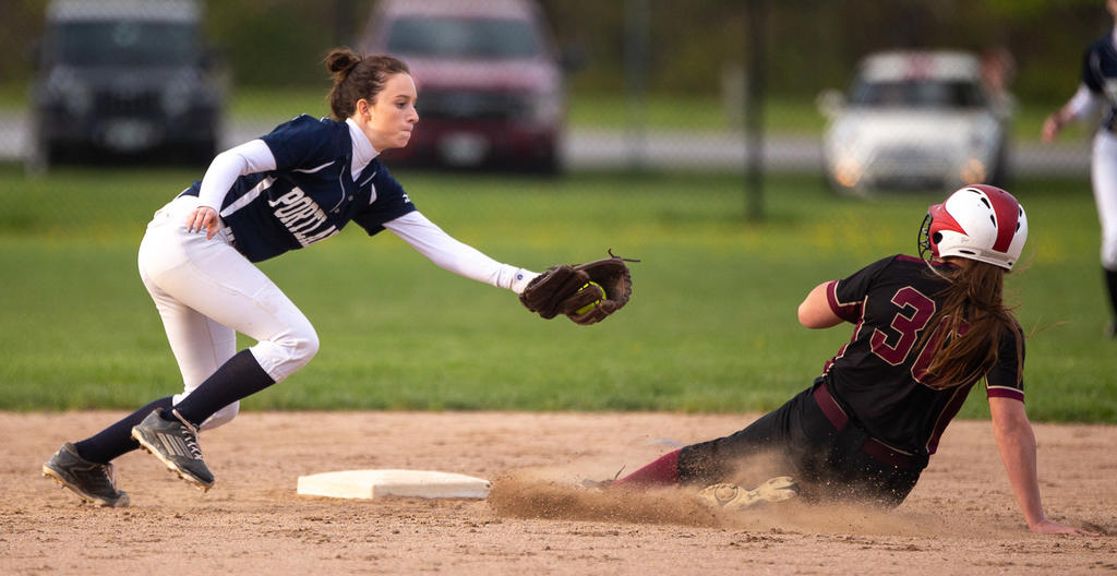 Portland senior shortstop Sydney Gilbert prepares to tag out Thornton Academy sophomore Olivia Lambert on a stolen base attempt.
