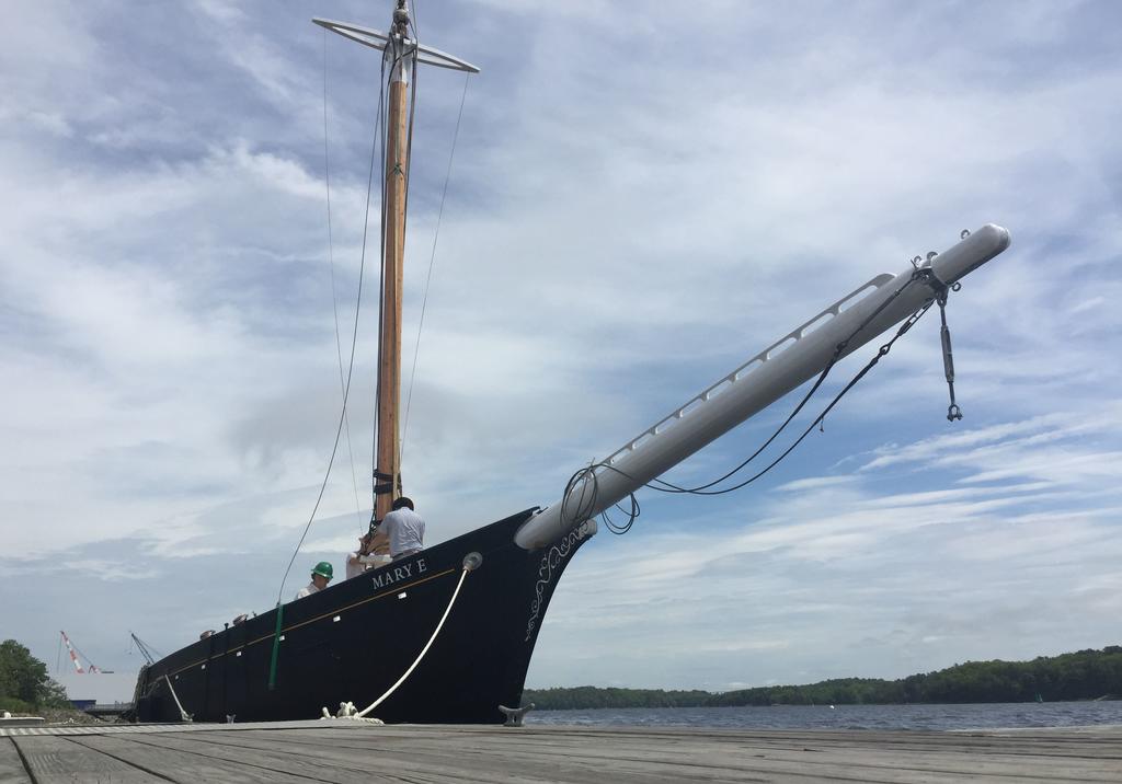 The Mary E after the foremast and bowspit were installed on the Kennebec River June 1. The vessel is due to be recommissioned at Maine Maritime Museum in Bath Saturday, June 9.