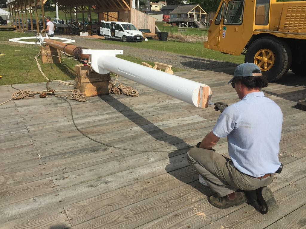 Master shipwright Andros Kypragoras paints the base of the Mary E’s foremast before it’s installed on the vessel.