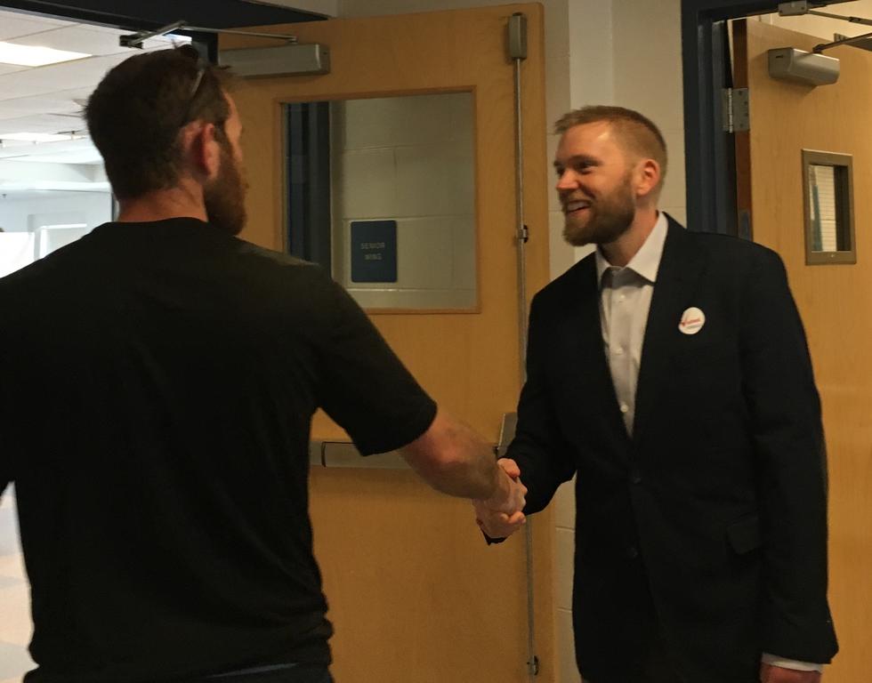 Democrat Christopher Kessler, right, of South Portland greets a voter June 12 at the South Portland Community Center. Kessler won his party’s nomination in House Distinct 32 seat, and will face Republican Tammy Walter in November.