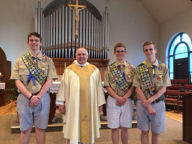 Eagle Scouts Jackson Rollins, left, and Parker Rollins and Life Scout Camden Rollins were awarded their faith’s Boy Scouts of America Religious Emblem, Ad Altara Dei, on June 2 by Fr. Daniel Greenleaf of the Parish of the Holy Eucharist. The sons of Noel and Gina Rollins, of Yarmouth, the boys are members of Troop 35, charted by the First Parish Congregational Church of Yarmouth and part of the Casco Bay District and Pine Tree Council.