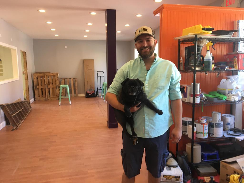 Sam Wilson and his dog Gir at Black Pug Brewing at 30 Bath Road. Wilson and a business partner hope to have the brewery open by October.