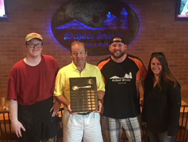 The School Street Pub and Grill is awarded the Golden Spoon Award as this year’s winner of Gorham Taste Walk. Pictured, from left, are Chef Shaun Stoothoff; Drew King of YoungLife Sebago, which sponsors the event; Al Asali, owner; and Suzie Phillips, Taste Walk coordinator. Blue Pig Diner was second and MK Kitchen, third. Blue Pig Diner won the Kids Choice, a new category this year.