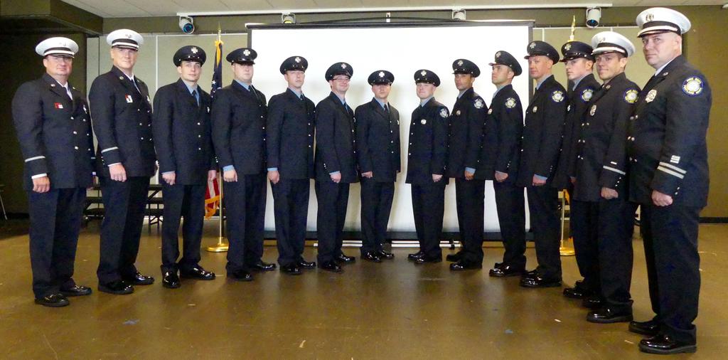 Portland Fire Department officials join graduates: Jared G. Graham, Christopher T. Stiles, Daniel P. Verril, Samuel J. Balzano1, Gregory H. Felstead, Spencer J. Bailey, Nicholas J. Bue, Jacob W. Cole, Jesse A. Bieluch, and Kelsey M. Cummings. (Diane Hudson / For The Forecaster)