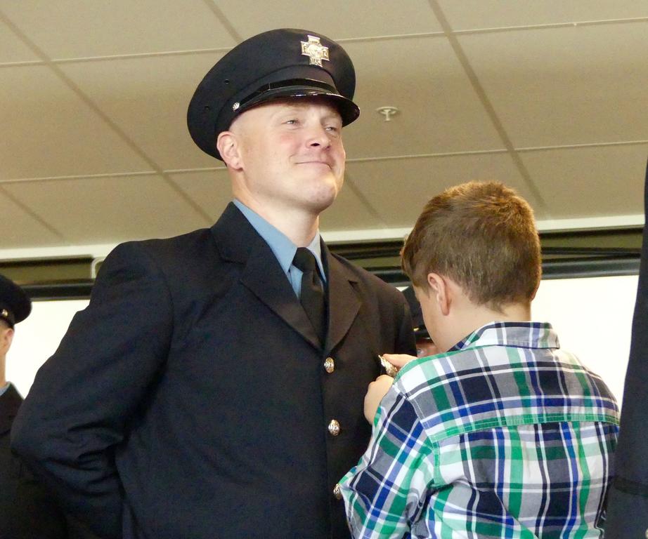 Portland firefighter Daniel P. Verrill beams as he has his badge pinned by his son Saturday, July 28, when the Portland Fire Department celebrated the graduation at East End Community School of 10 new firefighters from fire training school. (Diane Hudson / For The Forecaster)