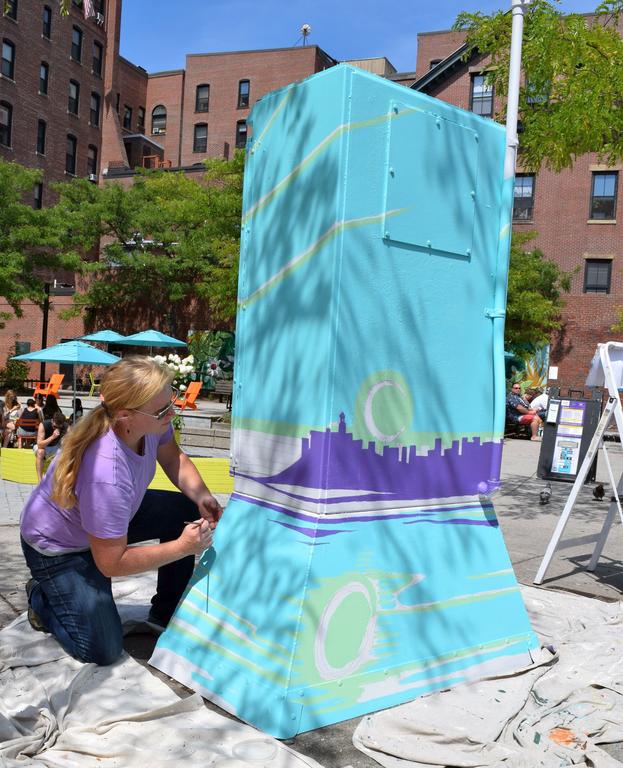 South Portland resident Kerrin Parkinson paints a utility box Aug. 5, 2016, in Portland’s Congress Square. City police and local businesses have resumed the program this summer as a way to fight graffiti in the city.