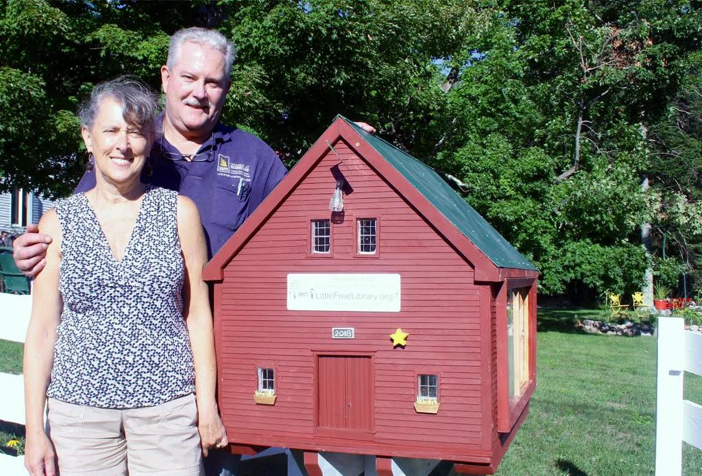 Carla McAllister and Tim Rice opened their Dragonfly Farm Little Free Library in early September. Rice built it to resemble the 1893 barn on the premises of their homestead at 585 Shaker Road.