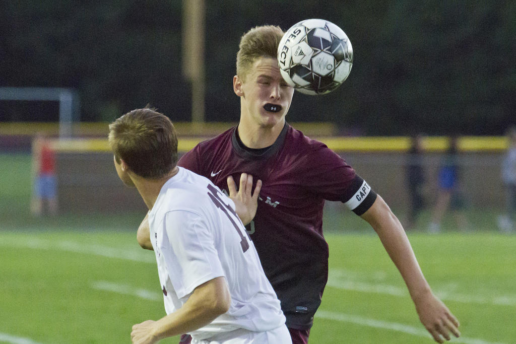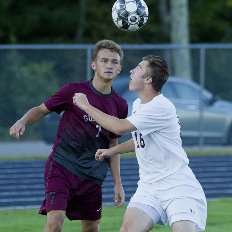 Gorham’s Grant Nadeau gets air over TA’s Alec McAlary in pursuit of a header.