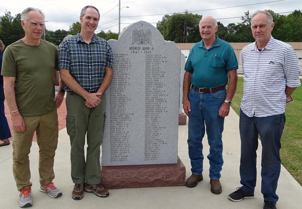 Rupert Watson, left, Tom Blake, Phil Blake and David Watson, along with others, met Sept. 19 at the New Gloucester Veterans Monument to see the inscription for the Watsons’ uncle, a British WW II pilot in the Royal Navy who perished over the skies of New Gloucester during training maneuvers in 1943.