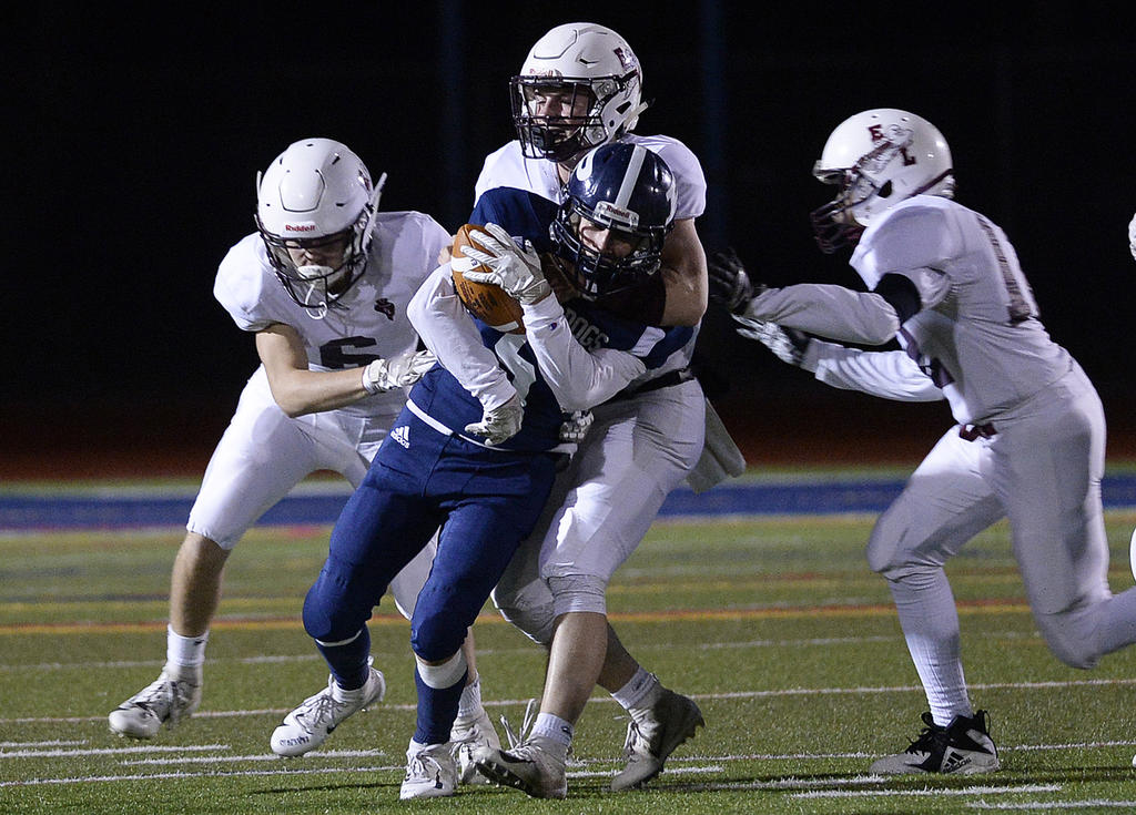 Portland senior Ben Stasium is wrapped up by three Edward Little defenders.