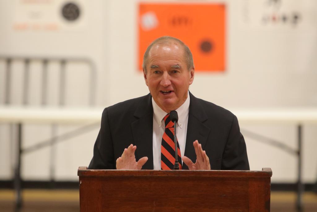 Longtime North Yarmouth Academy coach Bruce Myers gives an induction speech Friday after being inducted into the school’s Athletic Hall of Fame. Myers coached hockey, tennis and was best known for his coaching of lacrosse. He also served as Assistant Director of Development, Alumni Relations Director and the founder of the NYA holiday craft fair, as well as served as a tireless volunteer and mentor to countless student athletes. Myers was joined as an inductee Friday by Brian Gagne, Class of 1998. Gagne was a standout athlete on the cross-country, ice hockey and lacrosse teams. He was a star hockey goalie who led the Panthers to Class A state titles in 1997 and 1998.