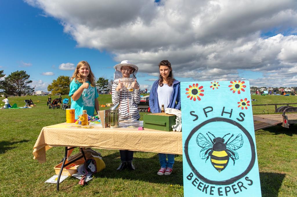 Helen Hamilton, Vanesa Barter and Gabbie Pellerin share information about the South Portland High School Beekeepers at Bug Light Field Day. The club has 20 members who manage an active hive at the school. (Dudley Warner / For The Forecaster)