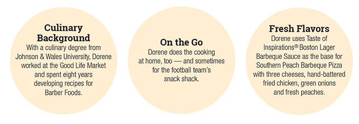 She’s also able to craft recipes including Taste of Inspirations® store-brand products, such as Boston Lager Barbeque Sauce, in unexpected ways. Case in point: Southern Peach Barbeque Pizza. There’s the barbeque sauce base and the Taste of Inspirations cheese blend of sharp cheddar, mozzarella and provolone topped with hand-battered fried chicken tenders, green onions and sliced peaches.