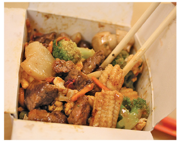In addition to sushi, fresh salads and sandwiches, and a rotating menu of hot dishes, there’s a Mexican bar, pizza and stir fry. “Stir fry is my favorite,” she says, dropping raw veggies into a Chinese takeout box. She gives the box to an associate, adding that she’d like steak, an egg and spicy peanut sauce. Less than 10 minutes later, she gets her box back with a made-to-order meal inside.