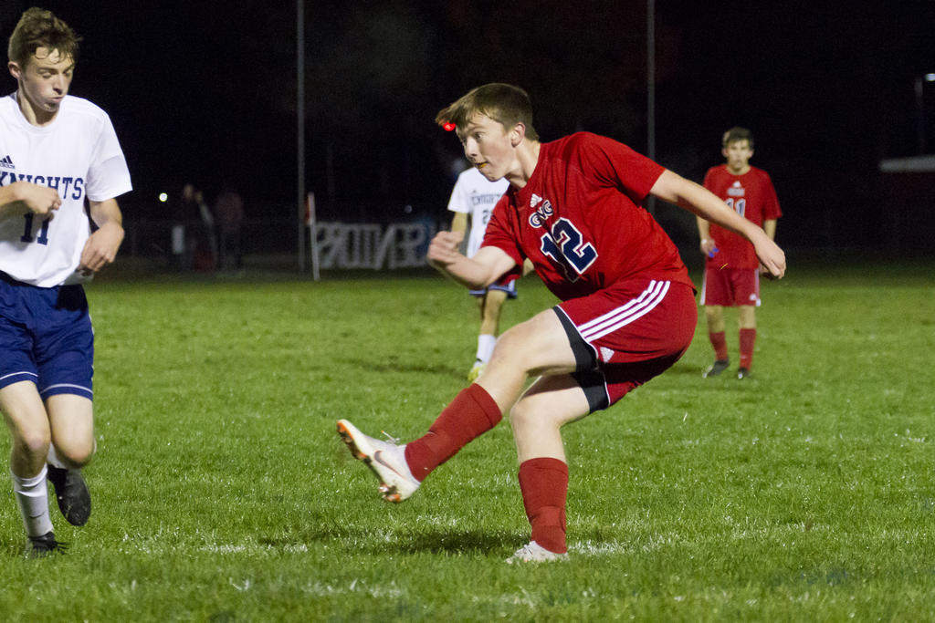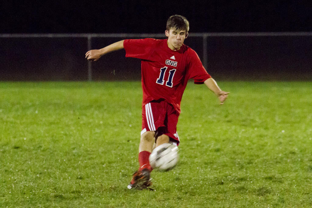 Andrew LaCerda sends a ball centerward. LaCerda scored the game’s only goal, securing a G-NG victory.