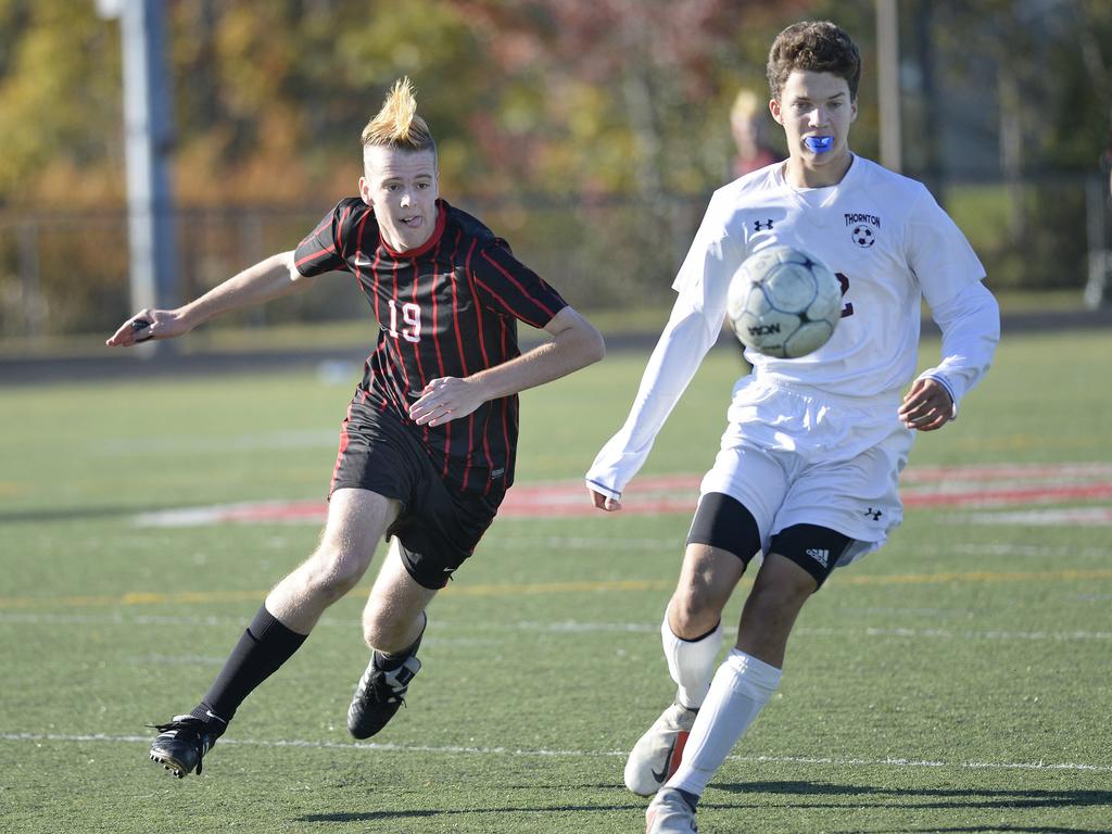Thornton Academy freshman Cody Bowker plays the ball as Scarborough junior Daniel Travers gives chase.