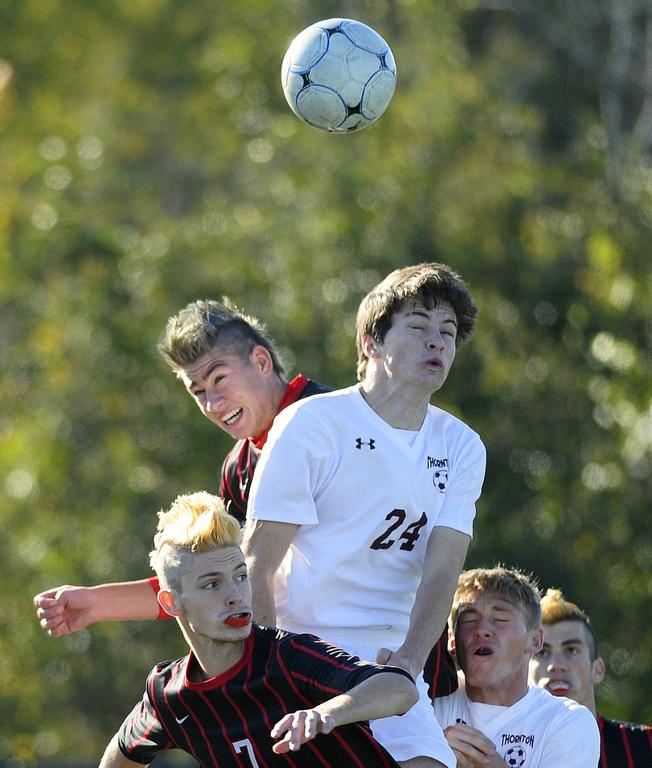 Thornton Academy junior Max Spaulding heads the ball away from Scarborough senior Liam Bridgham.