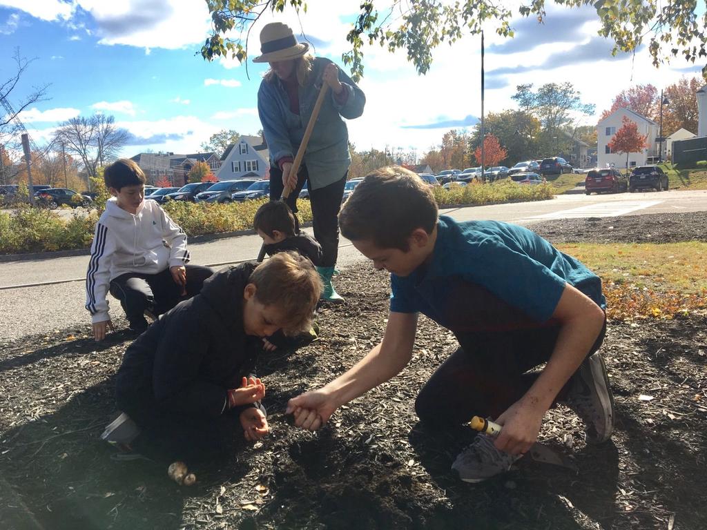 First-grader Tino James, left, and seventh-grade student Sam Bradford plant tulips together at the William H. Rowe School’s Rainbow Garden Oct. 25 in Yarmouth. Behind them, parent volunteer Amy Sinclair helps two students.